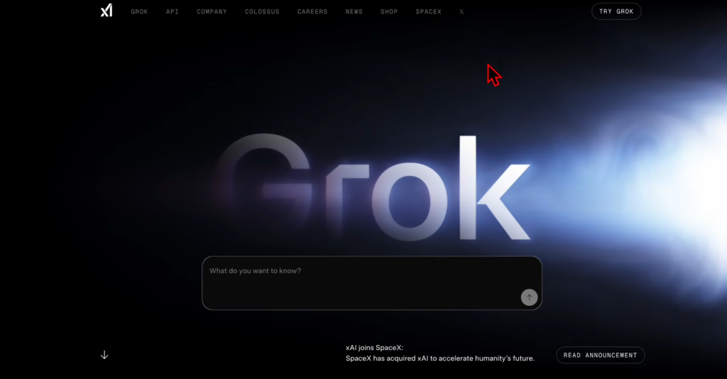 首先要用的就是用马斯克的这个Grok来搜索免费的节点池,你可以直接使用X AI,因为它本身就是Grok,你可以直接到Grok的官网注册一个账号就能用。如果你只是想试一试,可以先点一下右上角的try Grok进来以后就可以直接问问题了。