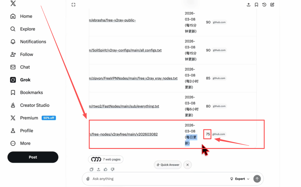 点完发送,它就自动开始想事儿和搜东西了。咱挑个活得久点的节点,这个推荐分才75,不过好在天天更新,理论上能撑满一整天。当然说是'每日更新',也不是打包票一定满24小时都有,就是每24小时换一下。敢这么吹应该有点底气吧。再者我也不想老刷客户端,麻烦。