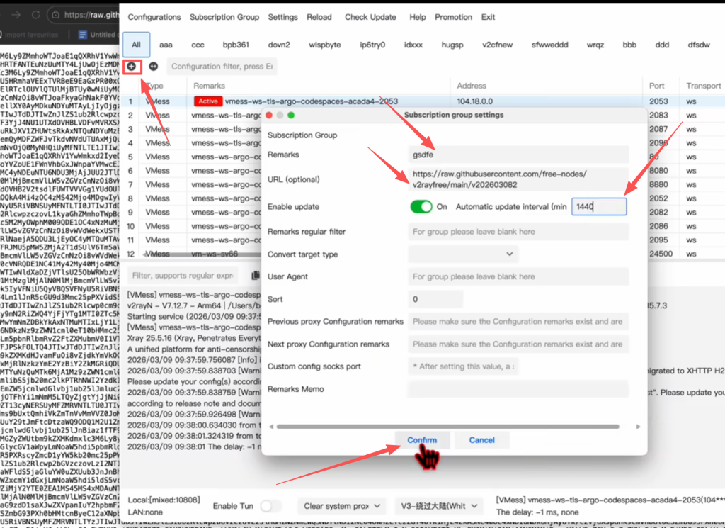 ,看一下它能不能用,东西是肯定有的,我们复杂一下链接,然后在客户端打开(我用的是v2ray,当然你们也可以用其他的别如NekoRay、Clash Verge、都可以的)客户端里点一下”+“号,给一个名字,这个名字可以自定义哈,把URL粘贴进来,它是每一天更新一次,也就是自动更新的时间设为1440分钟,点同意。