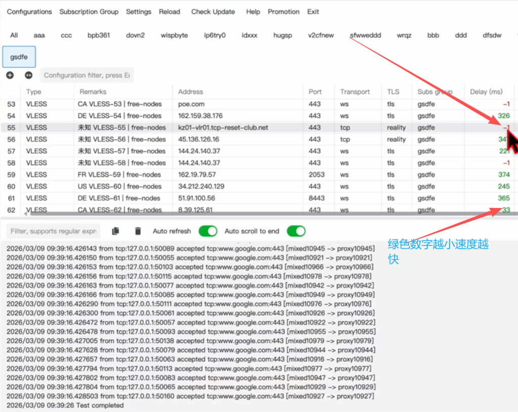 有这么多内容我们当然要全选一下,右击测个速度,大部分都是有速度的,换言之就是大部分都是可用的哈